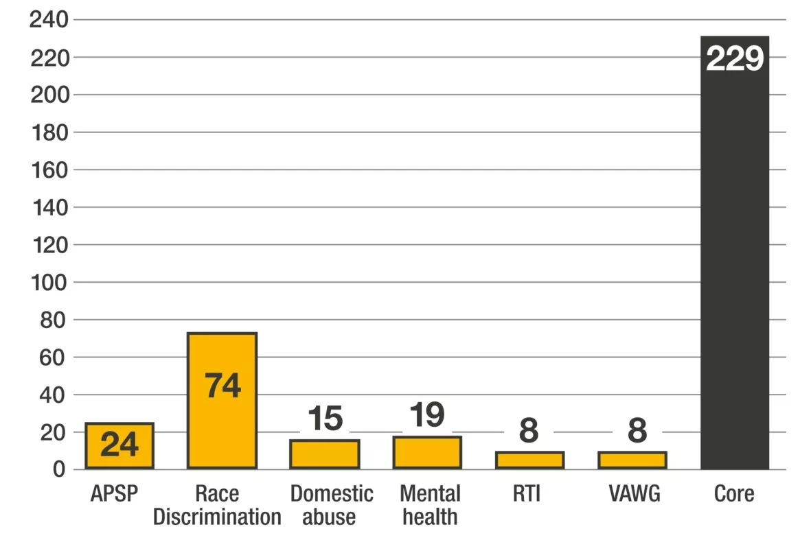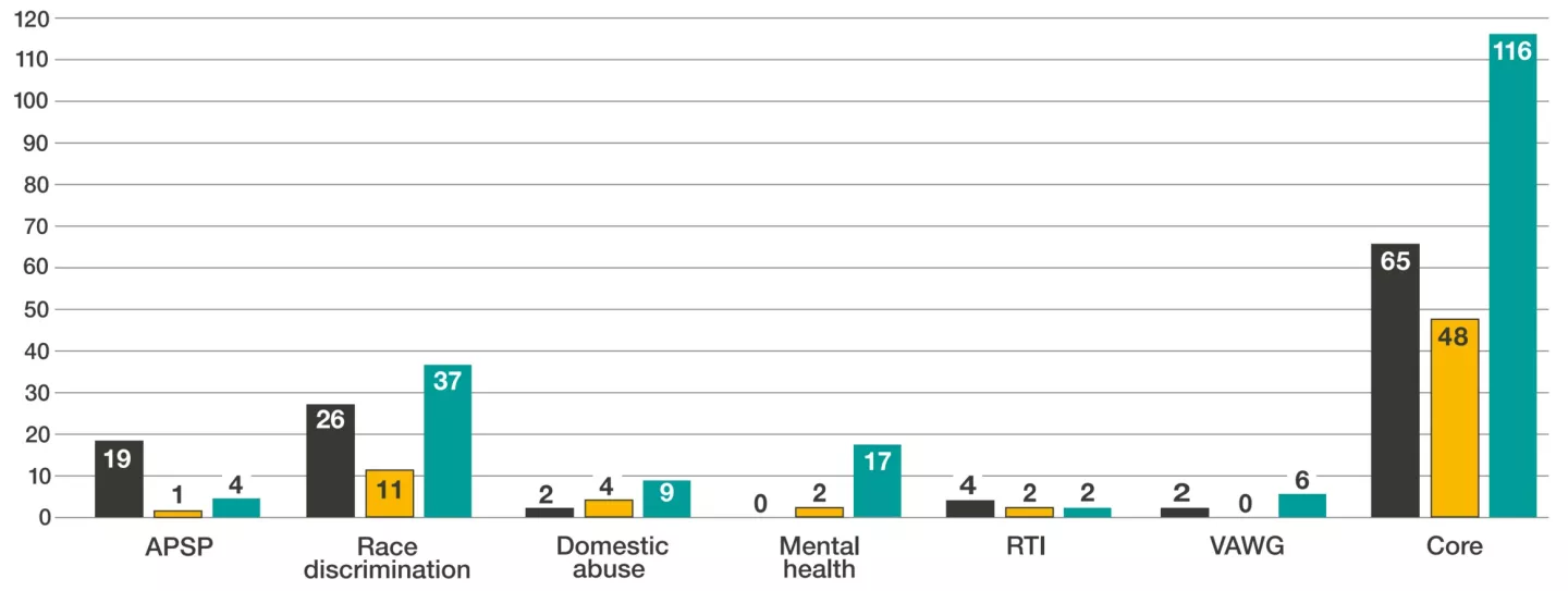 In April 2023, we introduced violence against women and girls as a new thematic area and added this to our case selection. As a result, some cases completed during the 2023/24 financial year may not have been classified under this theme because they were started before its introduction.
